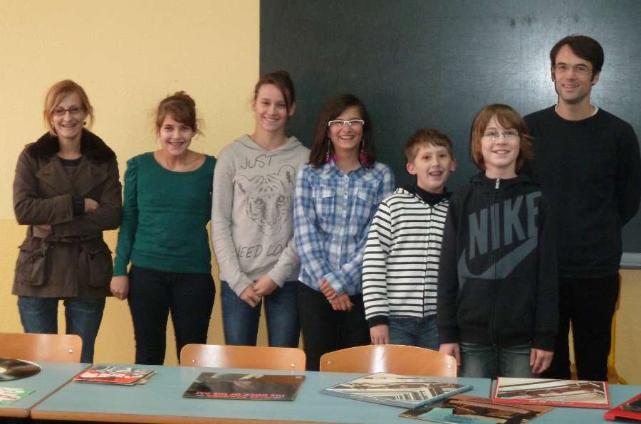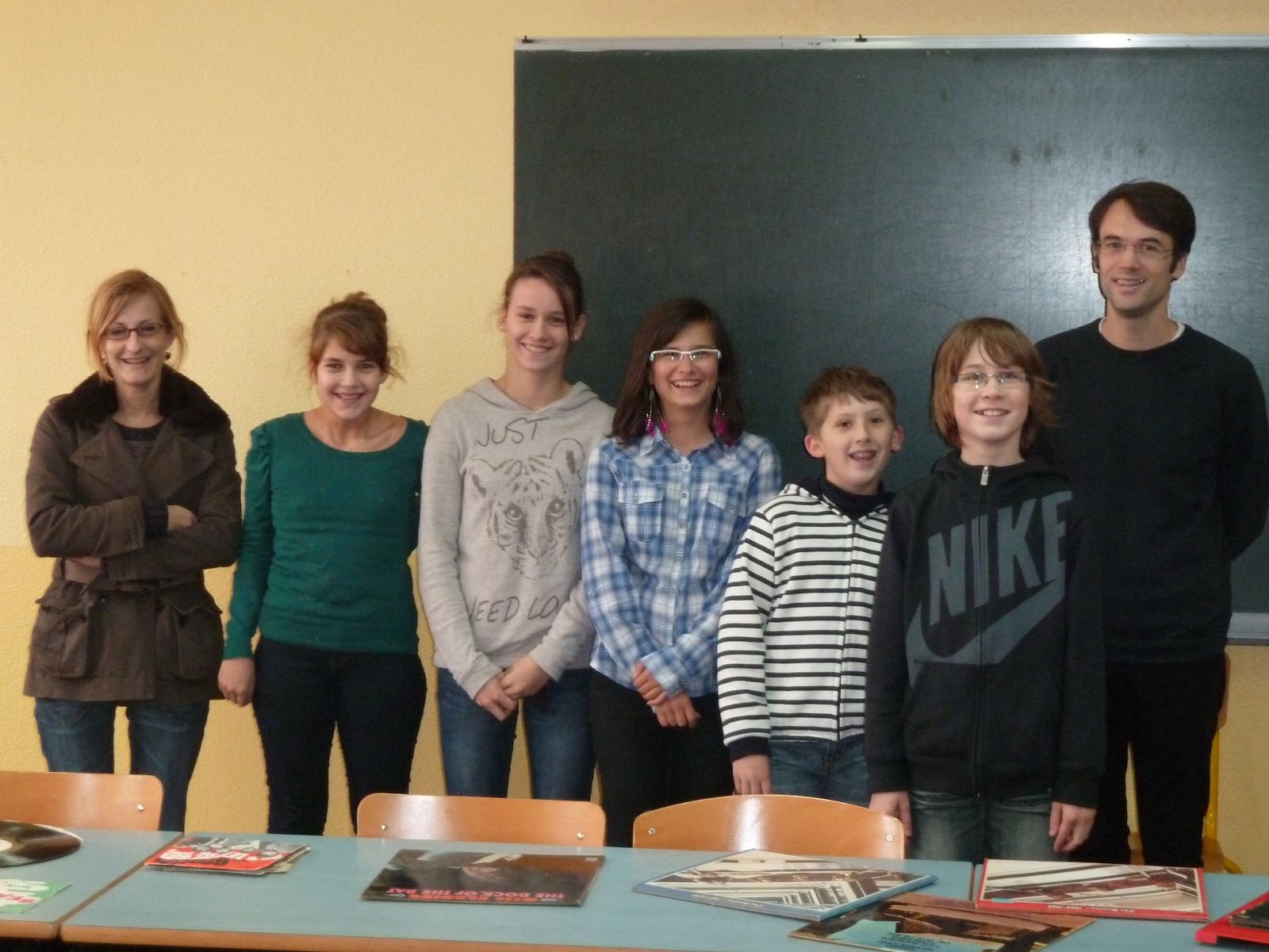 Anne-Laure (teacher), Manon, Adeline, Elyse, Matéo, Matthias, Lény (teacher) (from left to right)